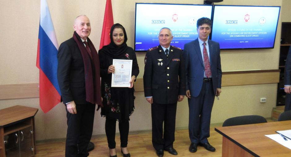 Ten Afghan law enforcement officers completed a ten-day training course on 5 April 2019, which focused on combating illicit drug trafficking and drug-related crimes. The course, held at the St. Petersburg University of the Ministry of Internal Affairs of the Russian Federation was organized by the Strategic Police Matters Unit of the OSCE Transnational Threats Department.
