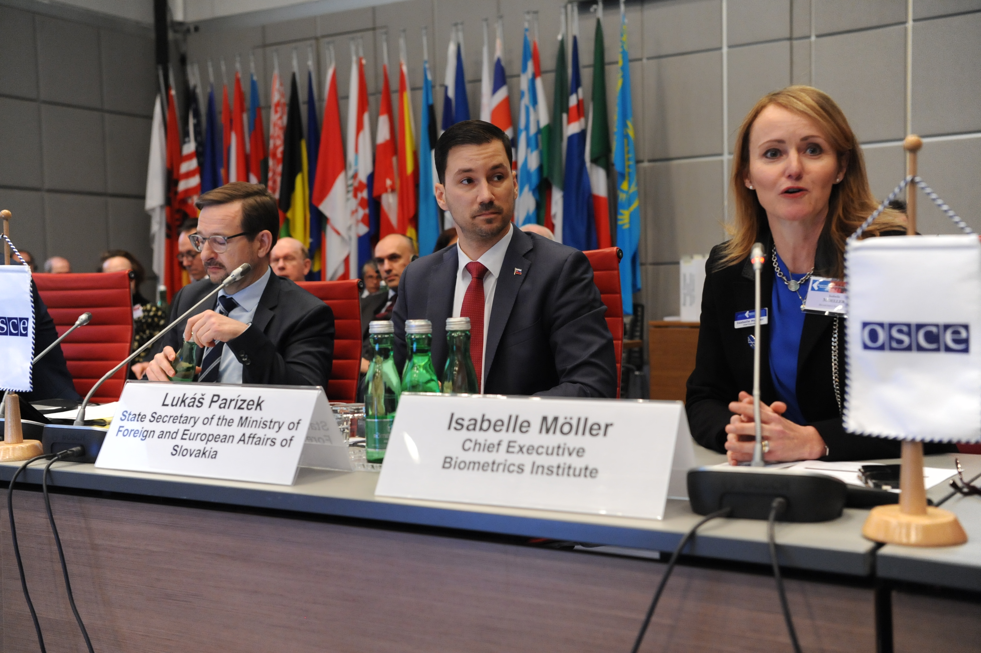 (L-r) OSCE Secretary General Thomas Greminger, Lukáš Parízek, State Secretary of the Ministry of Foreign and European Affairs of Slovakia, and Isabelle Moeller, Chief Executive of the Biometrics Institute, adressing the opening of the ID@Borders and The Future of Travel Conference, Vienna, 11 April 2019.