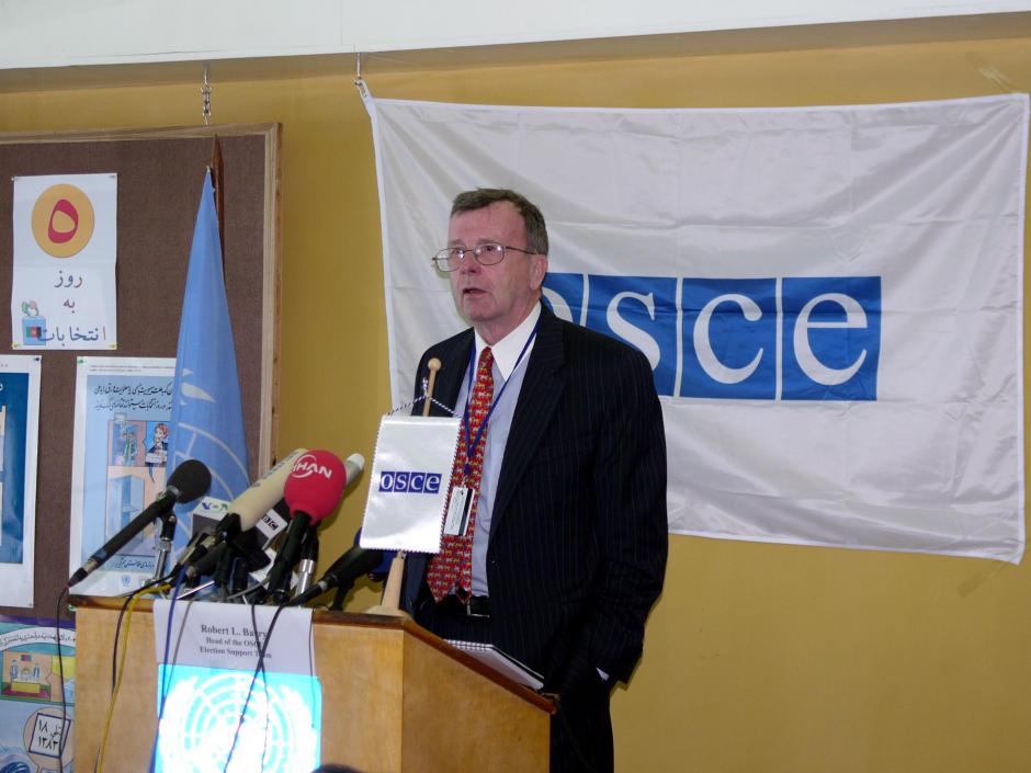 Ambassador Robert Barry, head of the OSCE Election Support Team to Afghanistan, briefs journalists in Kabul, 4 October 2004.