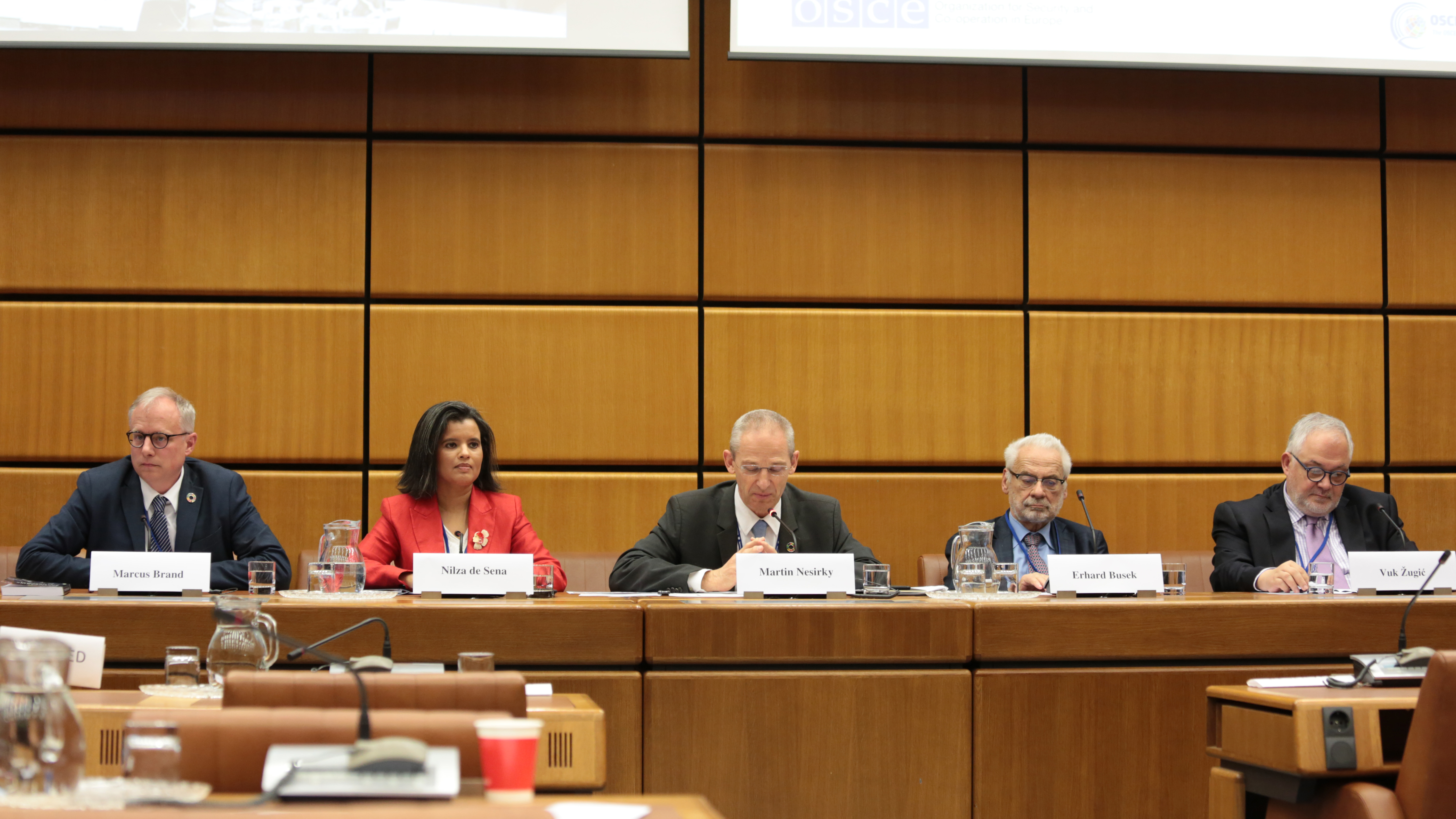 L-r: Marcus Brand, Senior Advisor of United Nations Development Programme in Ukraine, Nilza de Sena, OSCE Parliamentary Assembly, Martin Nesirky, Director of UN Information Service, Erhard Busek, Special Coordinator of the Southeast European Cooperative Initiative, Vuk Žugić, Co-ordinator of OSCE Economic and Environmental Activities, during the Security Day on “The OSCE and the Sustainable Development Goals”, Vienna, 4 June 2019.