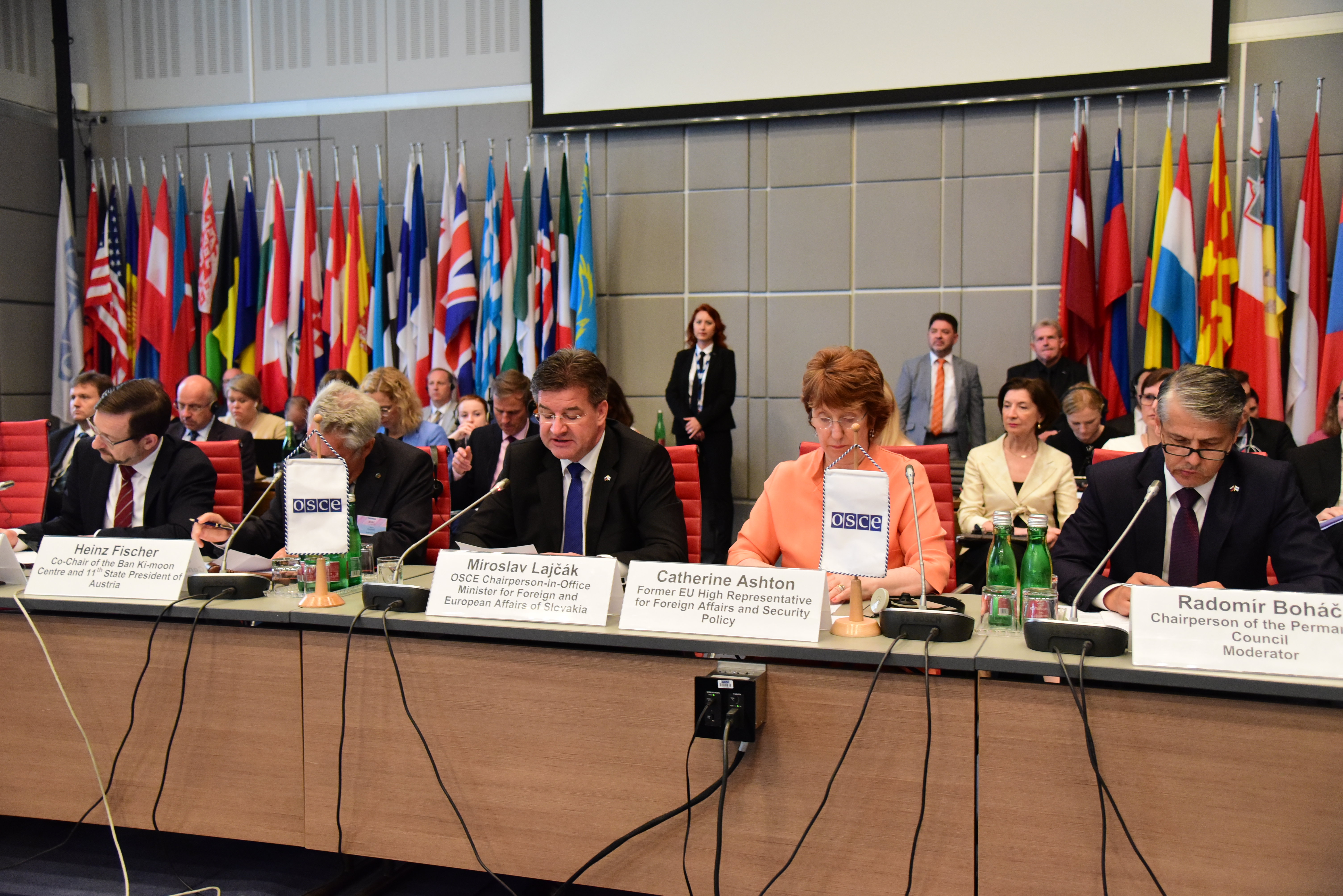 OSCE Secretary General Thomas Greminger, Co-Chair of the Ban Ki-Moon Centre and Former President of Austria Heinz Fischer, OSCE Chairperson-in-Office and Slovakia’s Foreign and European Affairs Minister Miroslav Lajčák and Former European Union High Representative for Foreign Affairs and Security Policy Rt Hon. Baroness Catherine Ashton at the opening session of the 2019 Annual Security Review Conference - Vienna, 24 June 2019