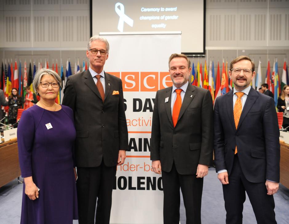 (l-r) OSCE Senior Adviser on Gender Issues Amarsanaa Darisuren, former senior military adviser at the Permanent Delegation of Switzerland Colonel Hans Georg Lueber, Ambassador Alessandro Azzoni of Italy, OSCE Secretary General Thomas Greminger at the White Ribbon Award ceremony, Vienna, 28 November 2019.