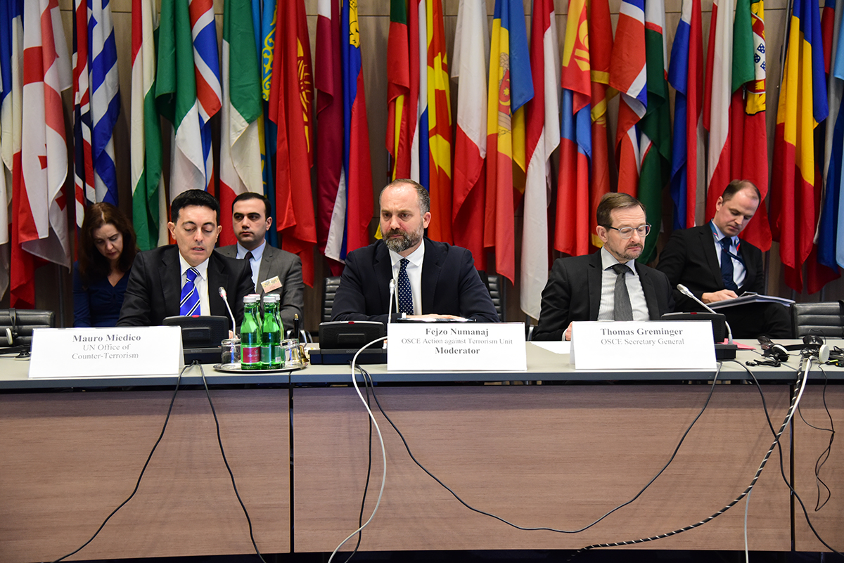 (L-r) Mauro Miedico, Director of the Special Projects and Innovation Division at the UN Office of Counter-Terrorism; Fejzo Numanaj, Deputy Head of the Action against Terrorism Unit of the OSCE Transnational Threats Department; and OSCE Secretary General Thomas Greminger open an OSCE-wide expert seminar on strengthening the protection of ‘soft’ targets against terrorist attacks, Vienna, 16 December 2019.