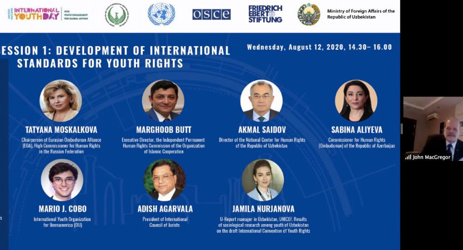 A two-day online high-level event focusing on the rights of young people, the Samarkand Forum on Human Rights, was held on 12 and 13 August 2020. The meeting, supported by the OSCE Project Co-Ordinator in Uzbekistan, was attended by representatives of the OSCE Secretariat, the OSCE Office for Democratic Institutions and Human Rights, the OSCE Parliamentary Assembly and other OSCE field operations. The event was co-organized with the Government of Uzbekistan represented by the National Human Rights Centre of Uzbekistan, the UN Country Team and Friedrich Ebert Stiftung. The Samarkand Forum on Human Rights is the continuation of the Asian Forum which took place in 2018 in Samarkand.