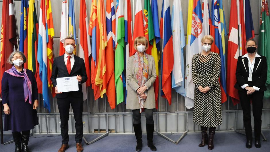 (l-r) Senior Adviser on Gender Issues Amarsanaa Darisuren, Deputy Director for Human Resources Micheal Conneely (one of the winners), OSCE Secretary General Helga Maria Schmid, Permanent Representative of Sweden to the OSCE Ambassador Ulrika Funered and Senior Co-ordination Adviser Vera Strobachova-Budway at the OSCE Gender Equality Champion awards, 11 March 2021, Vienna.
