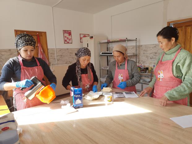 Aida opened her training centre in November 2020, in the midst of the COVID-19 pandemic. The OSCE Programme Office in Bishkek provided her with three sewing machines and a refrigerator and baking equipment for the pastry-making courses. Based on her ongoing consultations with the ESC she was able to forge a connection with the Asian Development Bank and signed a contract whereby the bank’s skills development fund finances women’s participation in her courses.