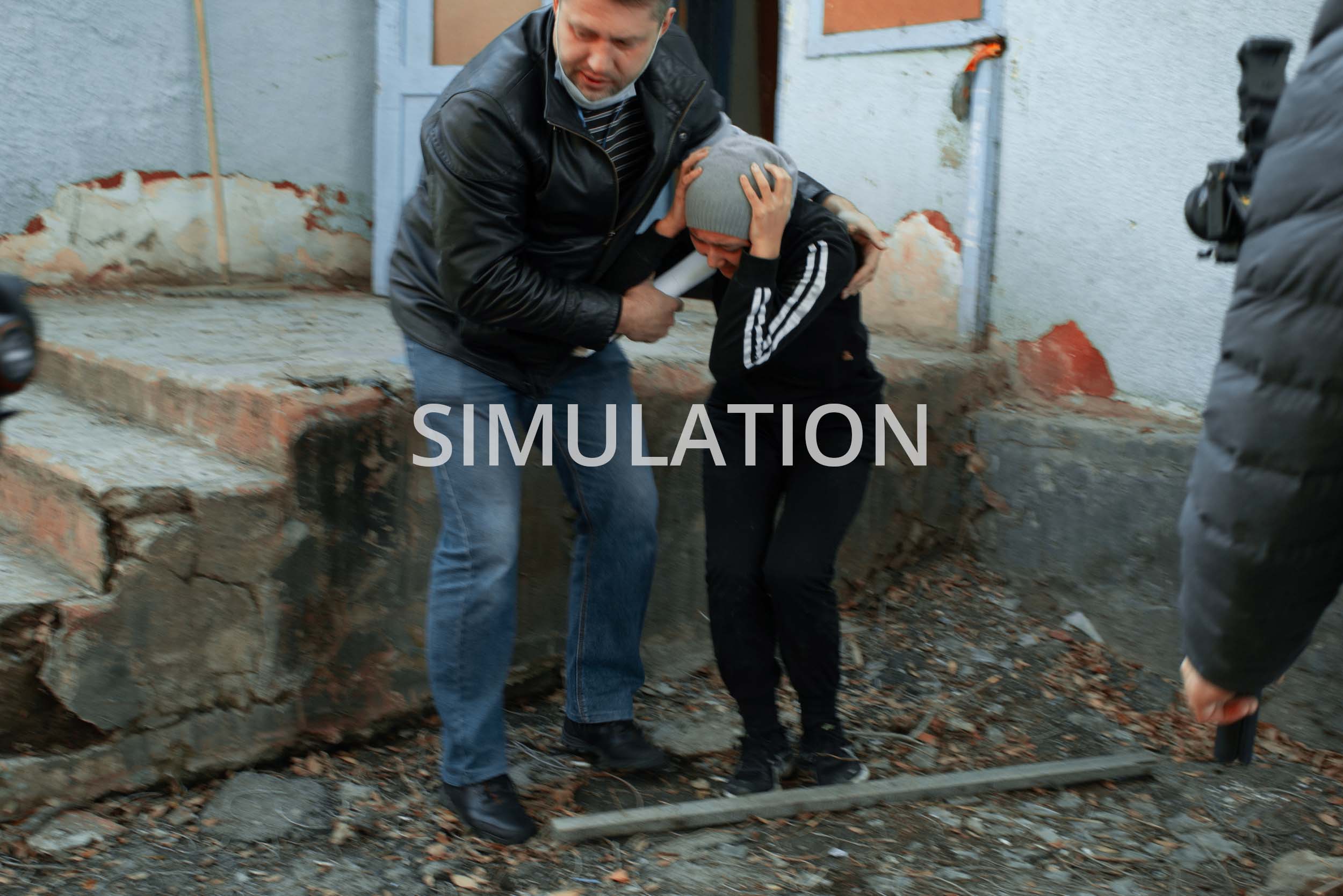 Alexandr Kossyuk, Director of the Public Association of Kazakhstan Association on Sexual and Reproductive Health (KASRH) and leader of a shelter for victims of trafficking, escorts a female victim of labour exploitation to a safe refuge, as part of the OSCE-organized simulation-based training exercise on combating human trafficking in Kazakhstan. Note: This photo depicts a simulation-based exercise. An actress plays the role of victim. October, 2021.