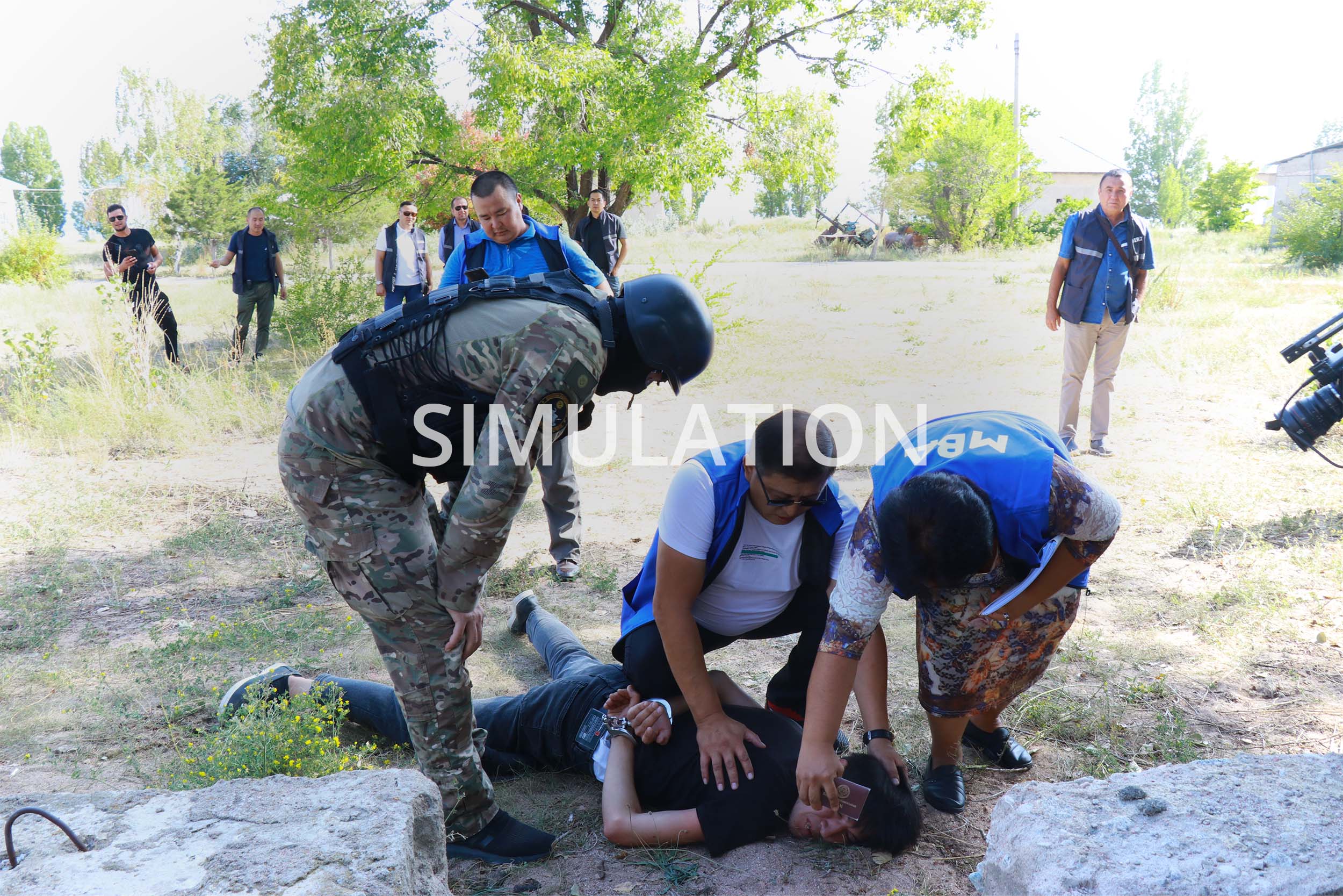 Special forces and criminal investigators (both male and female) detain the security guard of the fictitious brothel in the OSCE simulation-based training exercise in combating trafficking in human beings in Kyrgyzstan. Note: This photo depicts a simulation-based exercise. An actor plays the role of the detained security guard. September, 2021.