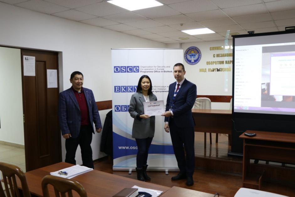 Representatives of the Service on Countering Illicit Drug Trafficking of the Ministry of Interior of the Kyrgyz Republic at the graduation ceremony after a three-day online capacity-building training course, Bishkek, 15 December 2021.