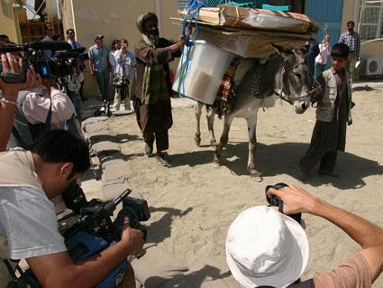 The Joint Electoral Management Body in Afghanistan shows the media how to mount an entire polling station on the back of a donkey, ahead of the parliamentary election on 18 September 2005.