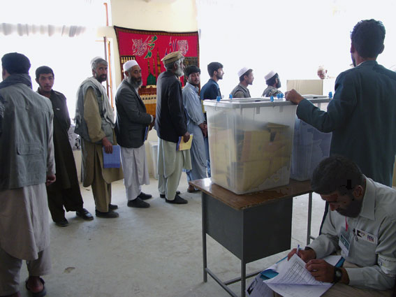 Afghans queue at a polling station on the outskirts of Kabul to vote in the country's parliamentary and local council elections on 18 September 2005.