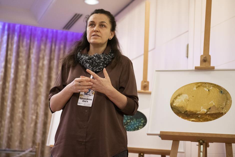 Ukrainian artist Daria Khrizanfova presents her series “Mirrors” in the margins of the OSCE-organized Great Dialogue on the Idea of Constitutionalism and Women’s Rights in Kyiv, 20 December 2021. In the first weeks of the Russian invasion, her studio in Kharkiv was reduced to a shambles, many of her drawings and paintings lost forever.