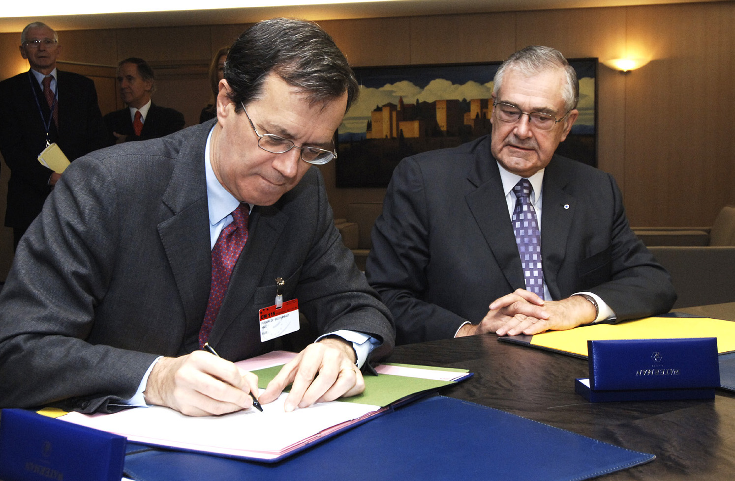 OSCE Secretary General Marc Perrin de Brichambaut (left) and Council of Europe Secretary General Terry Davis sign an agreement on common goals with regard to local and regional self-government in South-Eastern Europe, in Strasbourg, 17 November 2005.