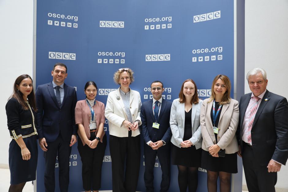 Ambassador Gesa Bräutigam, Permanent Representative of Germany to the OSCE, and Fritz Martin, Politico-Military-Adviser and Programme focal point at the Permanent Delegation of Germany, meet with Study Visit Programme participants, Vienna, 30 September 2022.