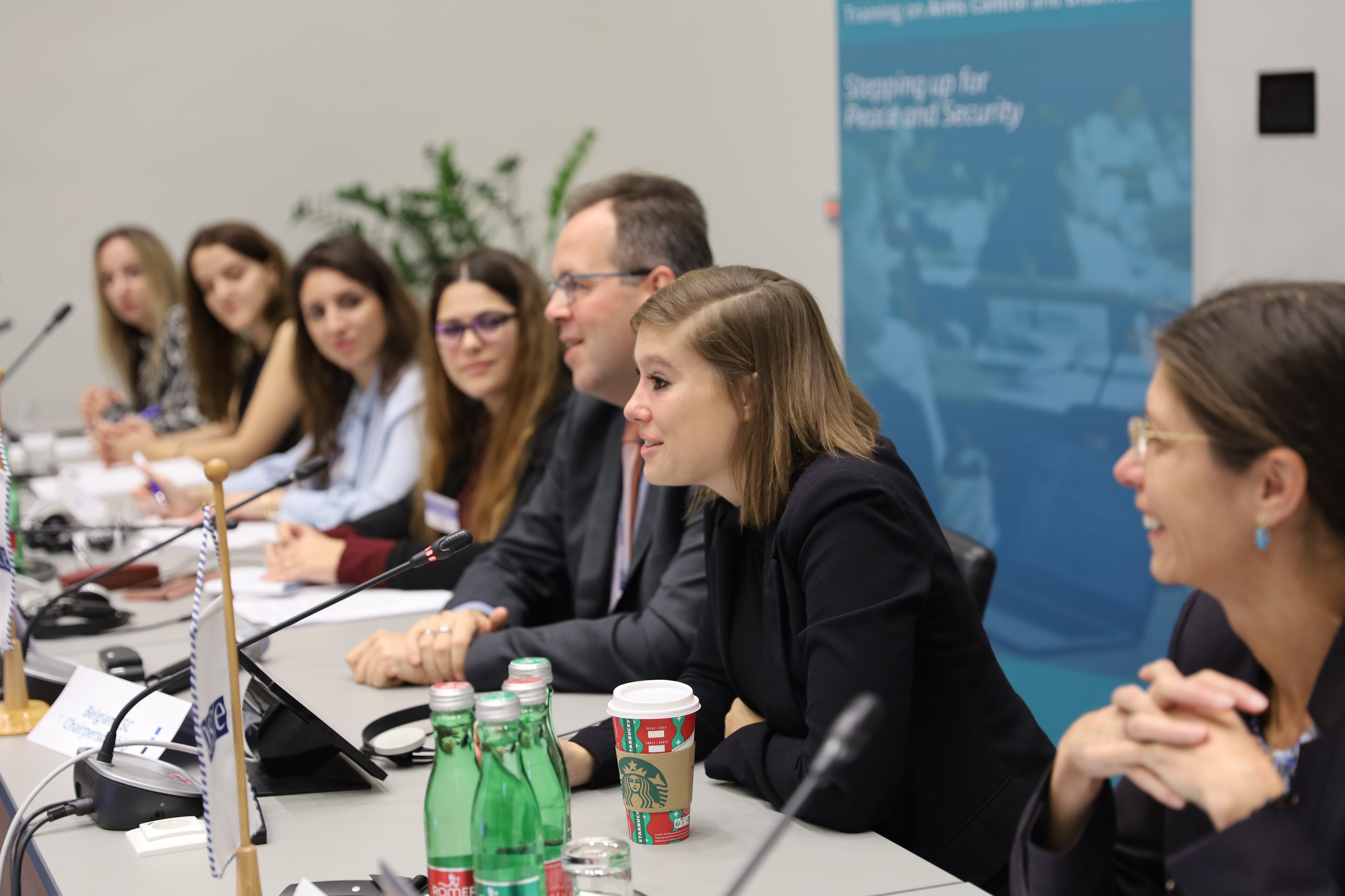 Representatives of the Belgian FSC Chair addressing 2022 Scholarship for Peace and Security participants on 9 November 2022.