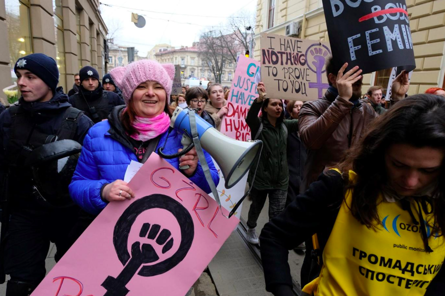 Marta Chumalo at Feminist March on International Women's Day, Lviv (Ukraine), 2020.