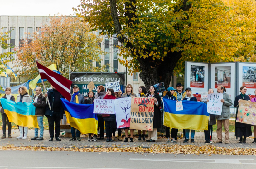 Yana Liubimova (centre), at demonstration supporting Ukraine in Latvia, 2022. (Photo from personal archive)