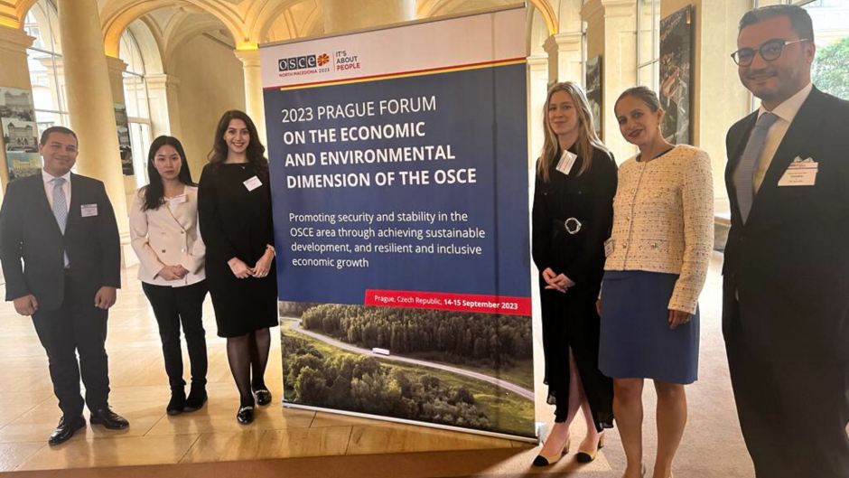 Participants of the 2023 OSCE Study Visit for Partners for Co-operation countries, with Marietta Koenig, Senior External Co-operation Officer and Project Manager during the 2023 Prague Forum on the Economic and Environmental Dimension of the OSCE, Prague, September 2023