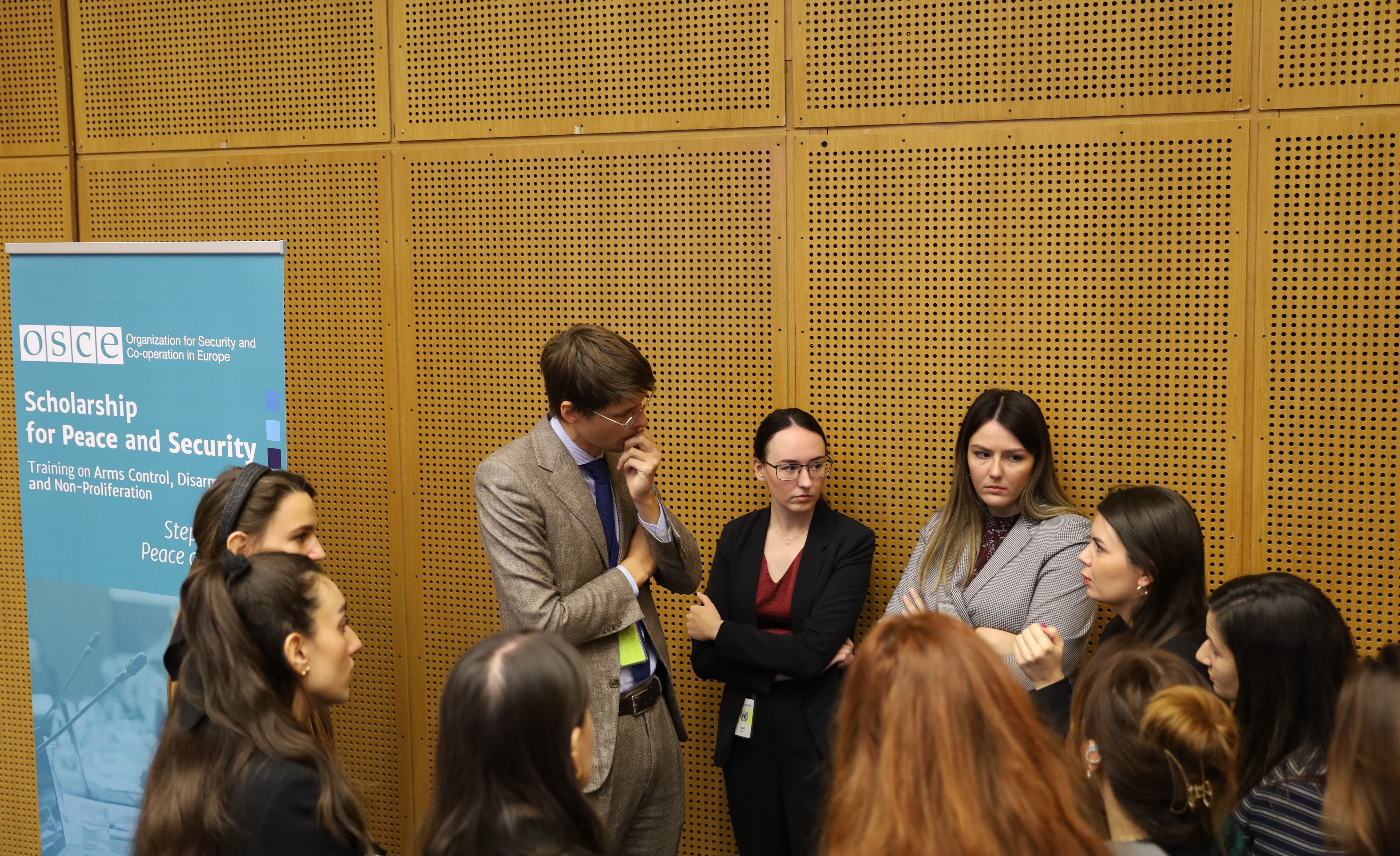 Participants of the OSCE Scholarship for Peace and Security engaging in a discussion with the representative of the United Nations Office on Drugs and Crime, Vienna, 9 November 2023