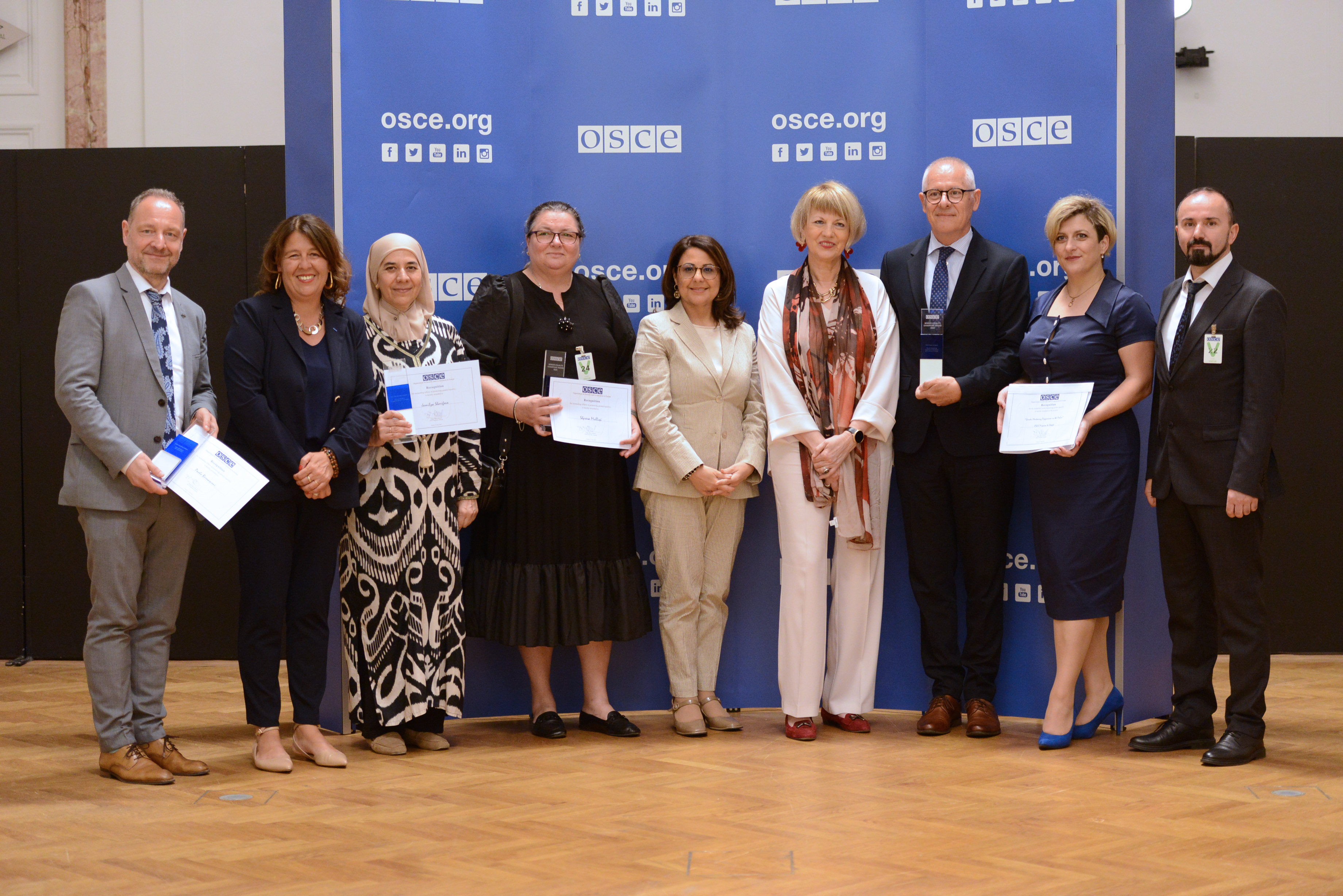 OSCE Secretary General Helga Maria Schmid, OSCE Senior Adviser on Gender Issues Lara Scarpitta and the Chair of the Permanent Council, Ambassador Natasha Meli Daudey with the winners of Gender Champions Award, Vienna, 11 July 2024.