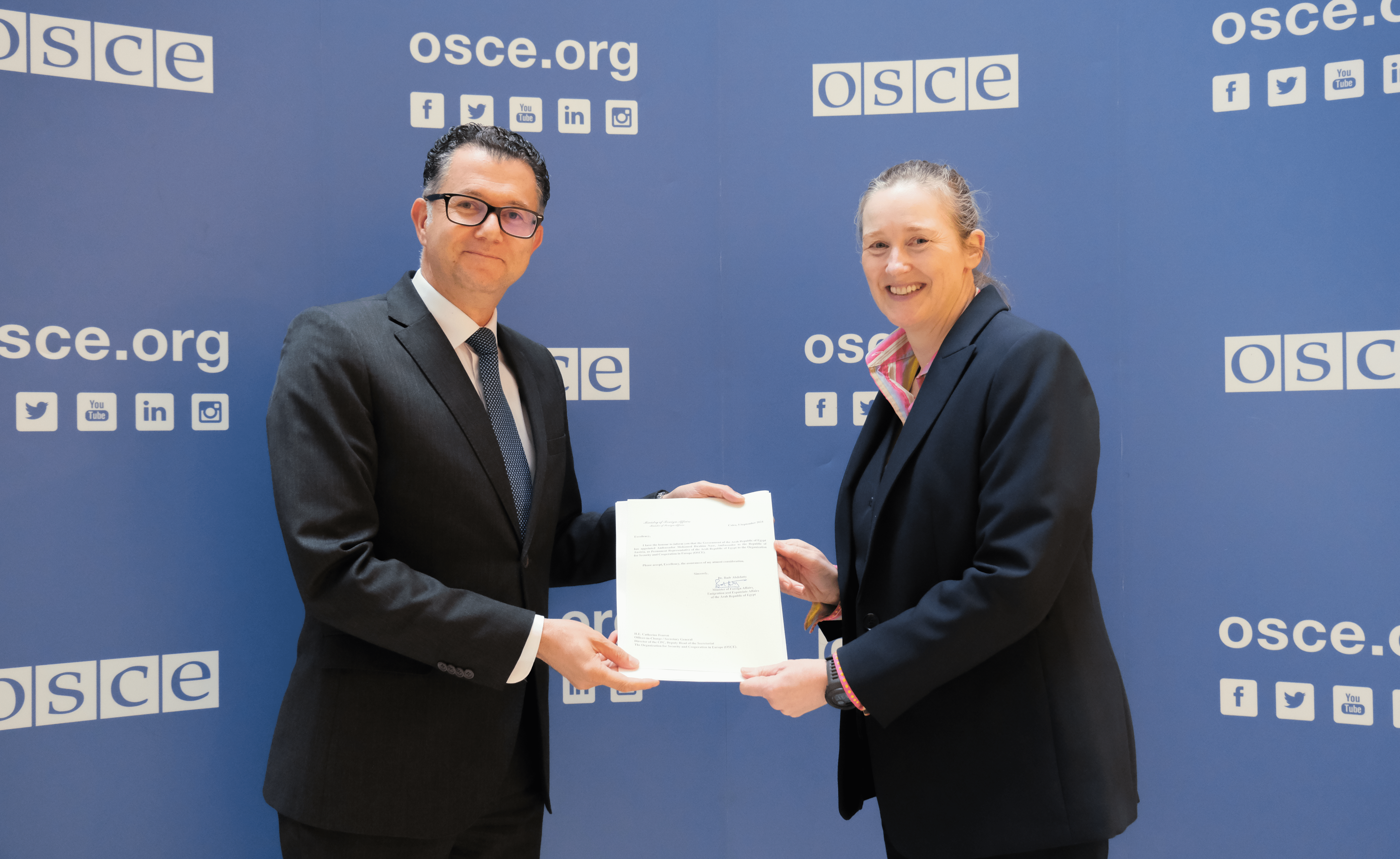H.E. Mohamed Nasr, Ambassador of the Arab Republic of Egypt, OSCE Partner for Co-operation with Ms. Kate Fearon, Officer-in-Charge/Secretary General and Director of the OSCE Conflict Prevention Centre, Deputy Head of the OSCE Secretariat, Vienna, 16 September 2024.