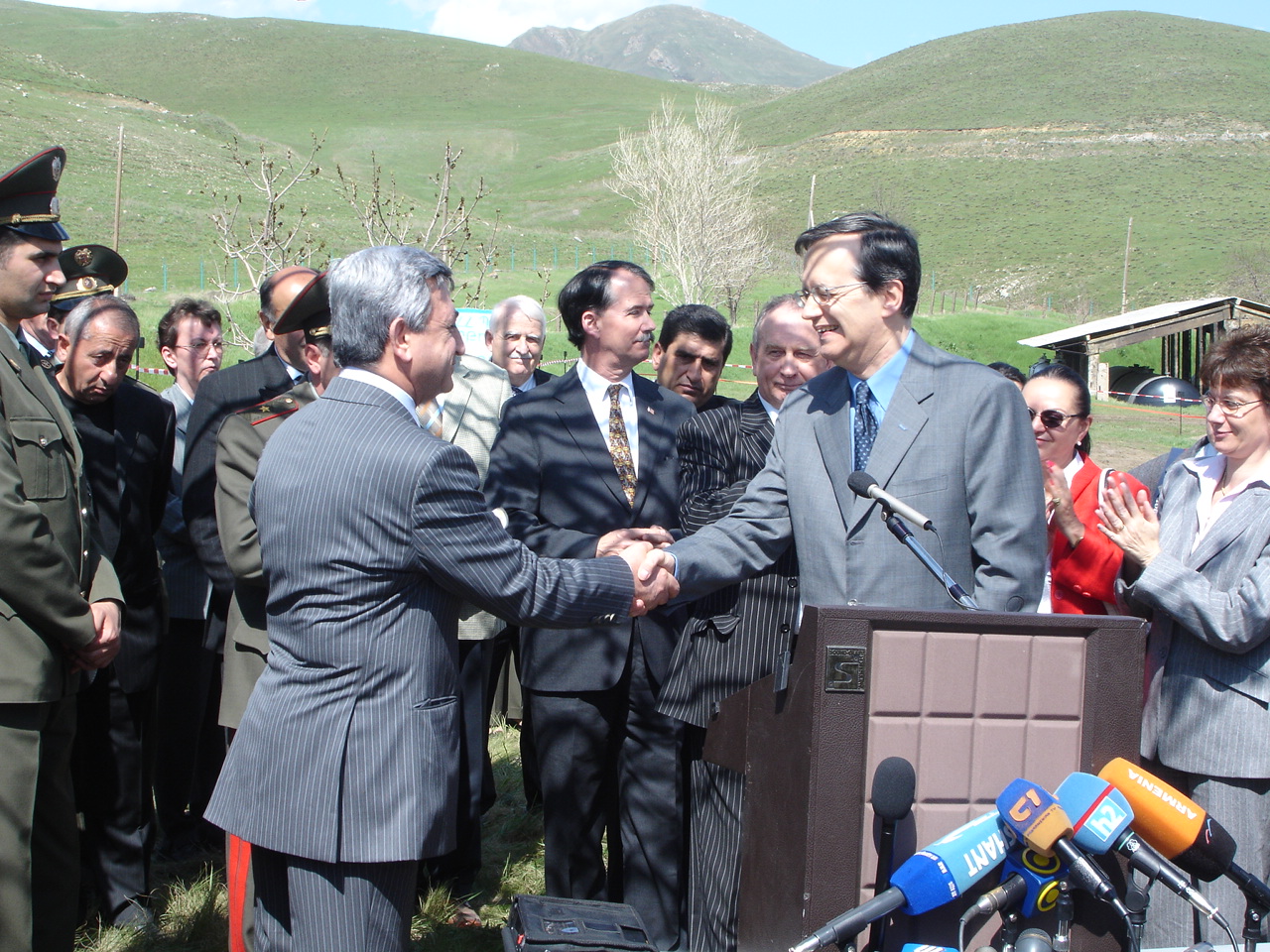 OSCE Secretary General Marc Perrin de Brichambaut (right) shakes hands with Armenian Defence Minister Serge Sargsyan at the opening of a "melange" processing installation at Kaltakhchi, Lori province, 12 May 2006.