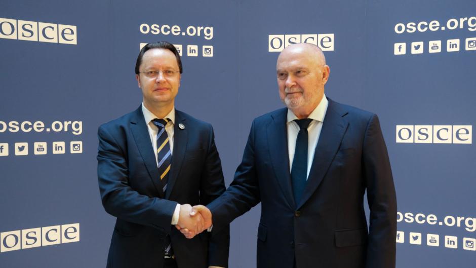 H.E. Yurii Vitrenko, Ambassador and Permanent Representative of Ukraine to the OSCE, with the OSCE Secretary General Feridun H. Sinirlioğlu, Vienna, 3 February 2025.