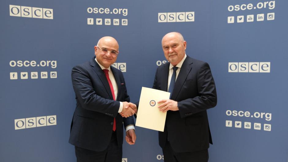 H.E. Alexander Maisuradze, Ambassador and Permanent Representative of Georgia to the OSCE, with the OSCE Secretary General Feridun H. Sinirlioğlu, Vienna, 7 March 2025.