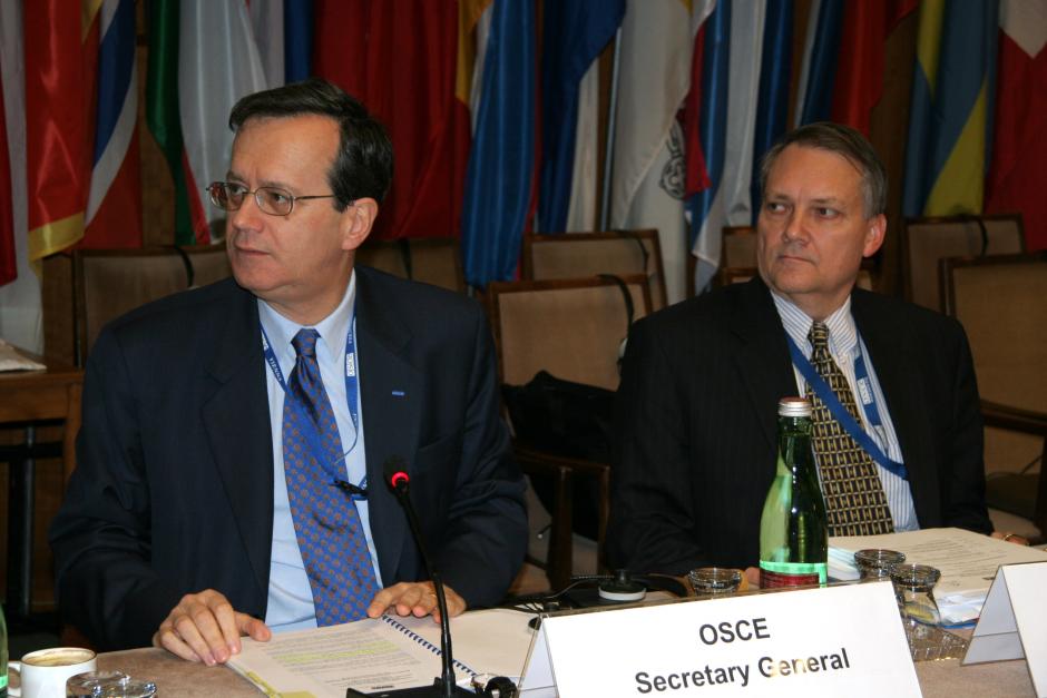 Secretary General Marc Perrin de Brichambaut (left) opens an annual tripartite meeting, in Vienna 14 February 2007. This year the meeting focused on counter-terrorism. Karl Wycoff, Head of OSCE Action against Terrorism Unit, looks on.