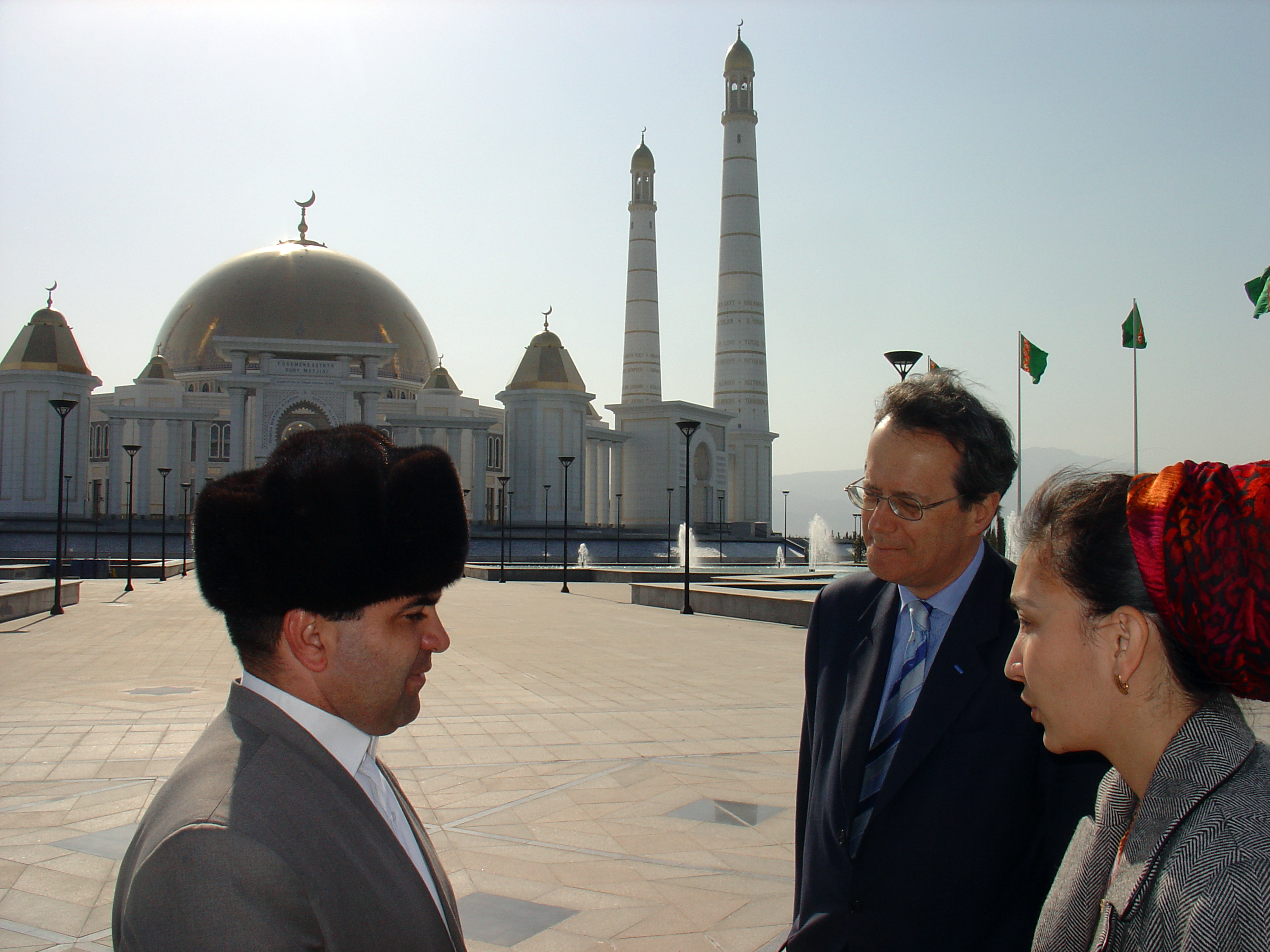 OSCE Secretary General Marc Perrin de Brichambaut (centre) speaks to the Imam of the mosque in Kipchak, near Ashgabat, during a visit to Turkmenistan, 5 March 2007.