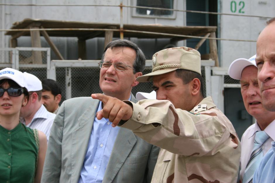 A Tajik border guard shows OSCE Secretary General, Marc Perrin de Brichambaut, border facilities at the Nizhniy Panj checkpoint on the Tajik-Afghan border, 27 June 2007.