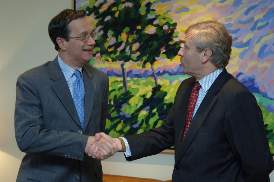 OSCE Secretary General Marc Perrin de Brichambaut (left) meets with NATO Secretary General Jaap de Hoop Scheffer at a bilateral meeting in Brussels, 11 July 2007.