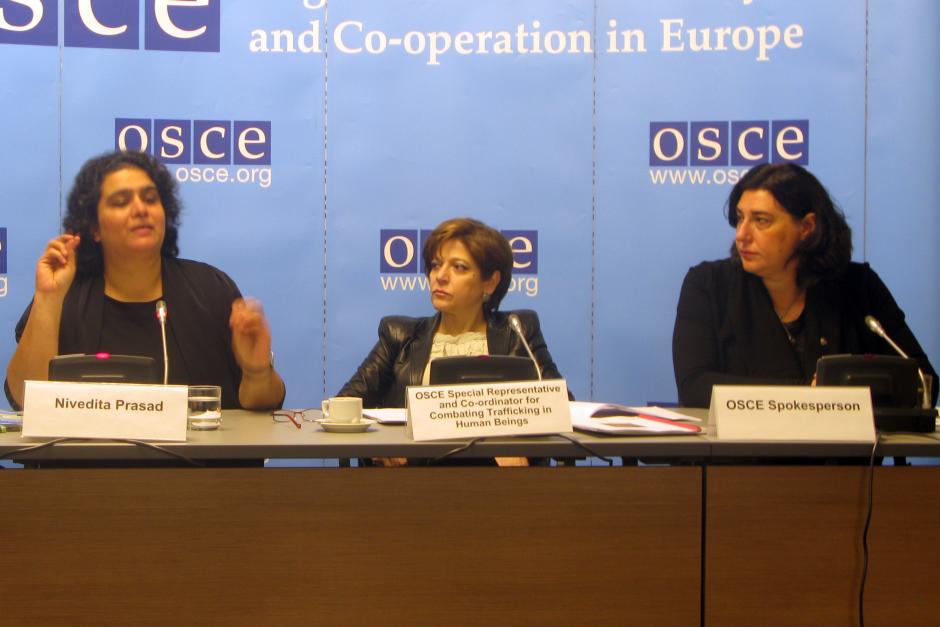 Left to right: Nivedita Prasad from the NGO BAN-YING (Germany), OSCE Special Representative and Co-ordinator for Combating Trafficking in Human Beings Maria Grazia Giammarinaro, and OSCE Spokesperson Virginie Coulloudon, at a press conference on the launch of a report on domestic servitude, Vienna, 28 February 2011.