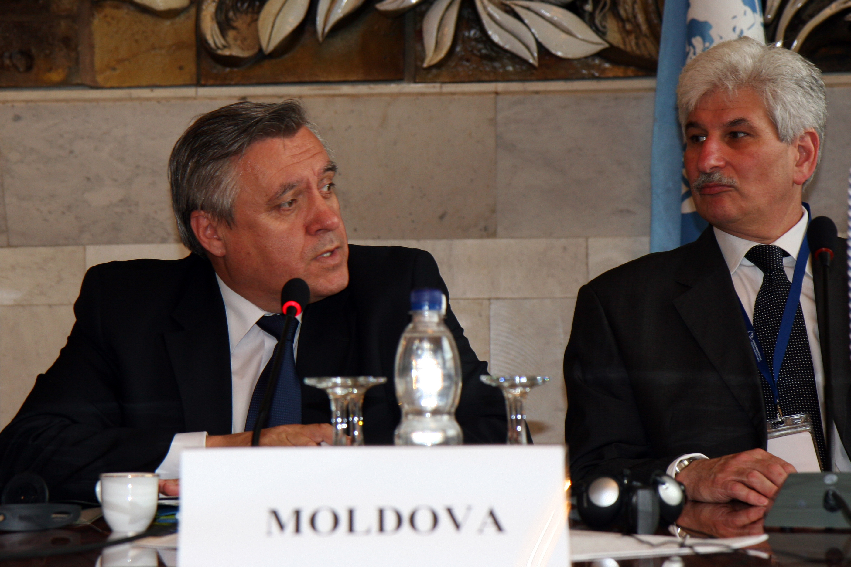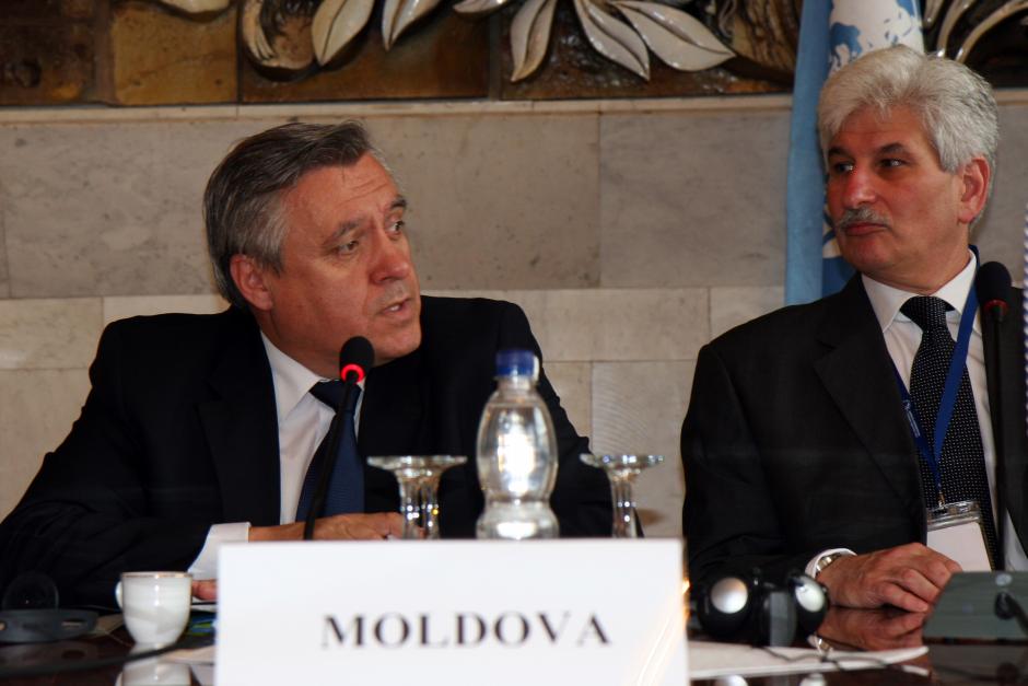 Environment Minister of Moldova, Gheorghe Şalaru (l) and Head of the OSCE Mission to Moldova Ambassador Philip Remler at an OSCE meeting on the Aarhus Centres, Chisinau, 29 June 2011.