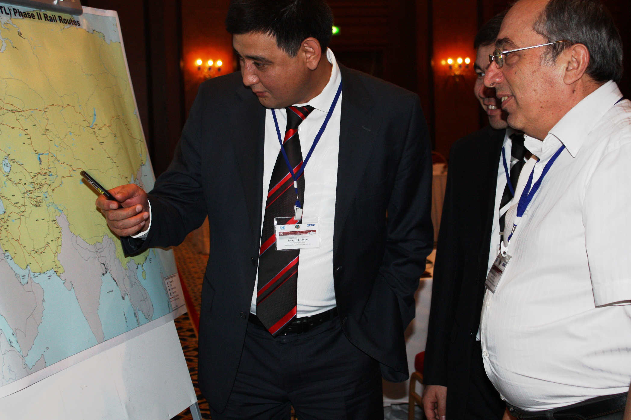 Participants at a OSCE-supported workshop discuss maps of Euro-Asian transport links, Almaty, 5 July 2011.