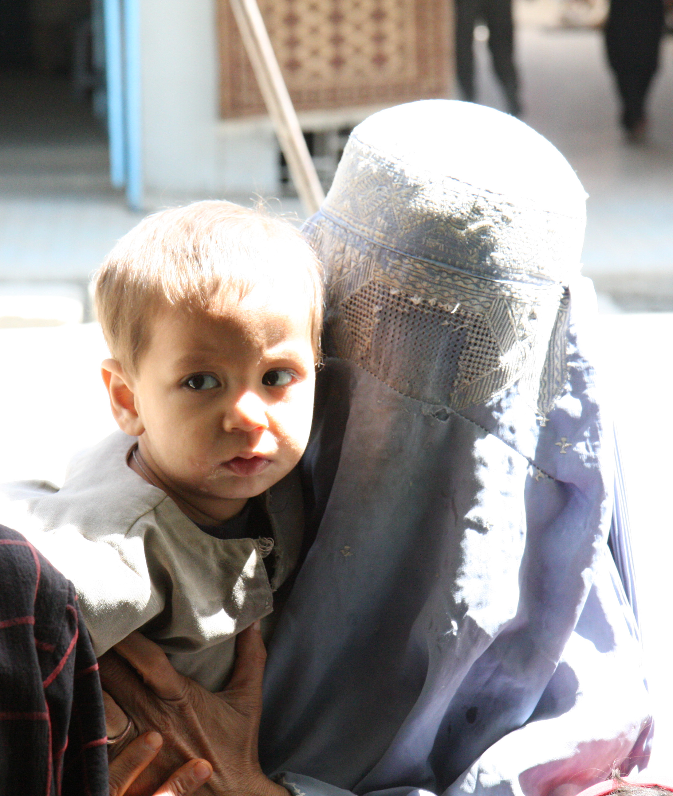 A burka-covered Afghan woman with a child in Kabul, 8 September 2008.