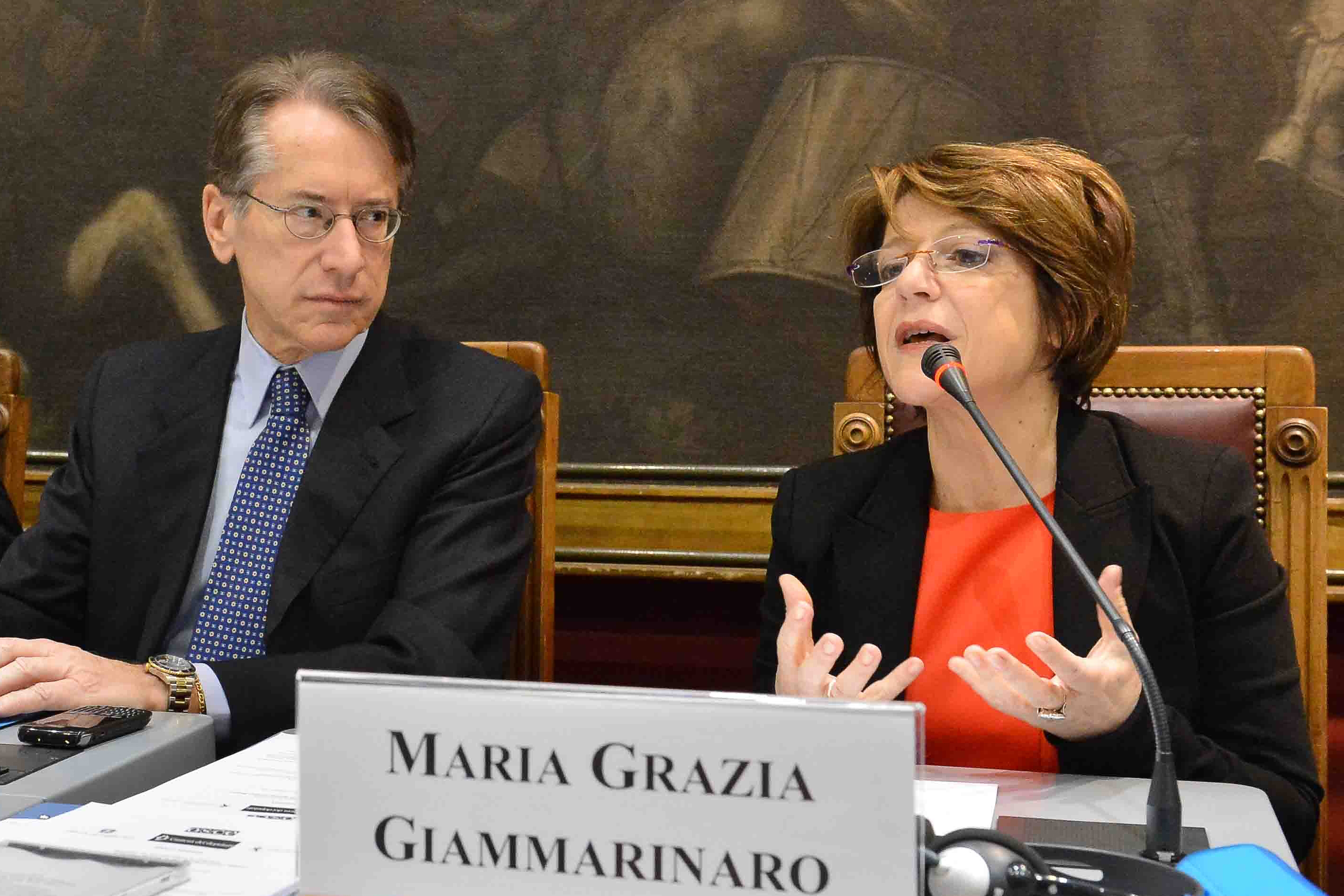 The OSCE Special Representative and Co-ordinator for Combating Trafficking in Human Beings, Maria Grazia Giammarinaro, speaks at a seminar on human trafficking in the Mediterranean region as Italy's Foreign Minister, Giulio Terzi, listens in, Rome, 8 February 2013.