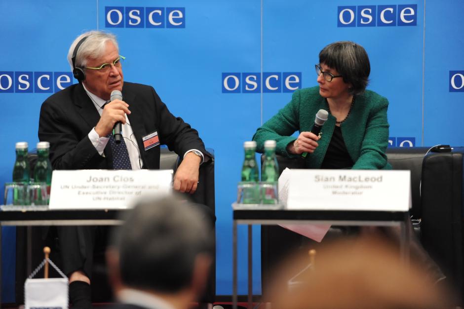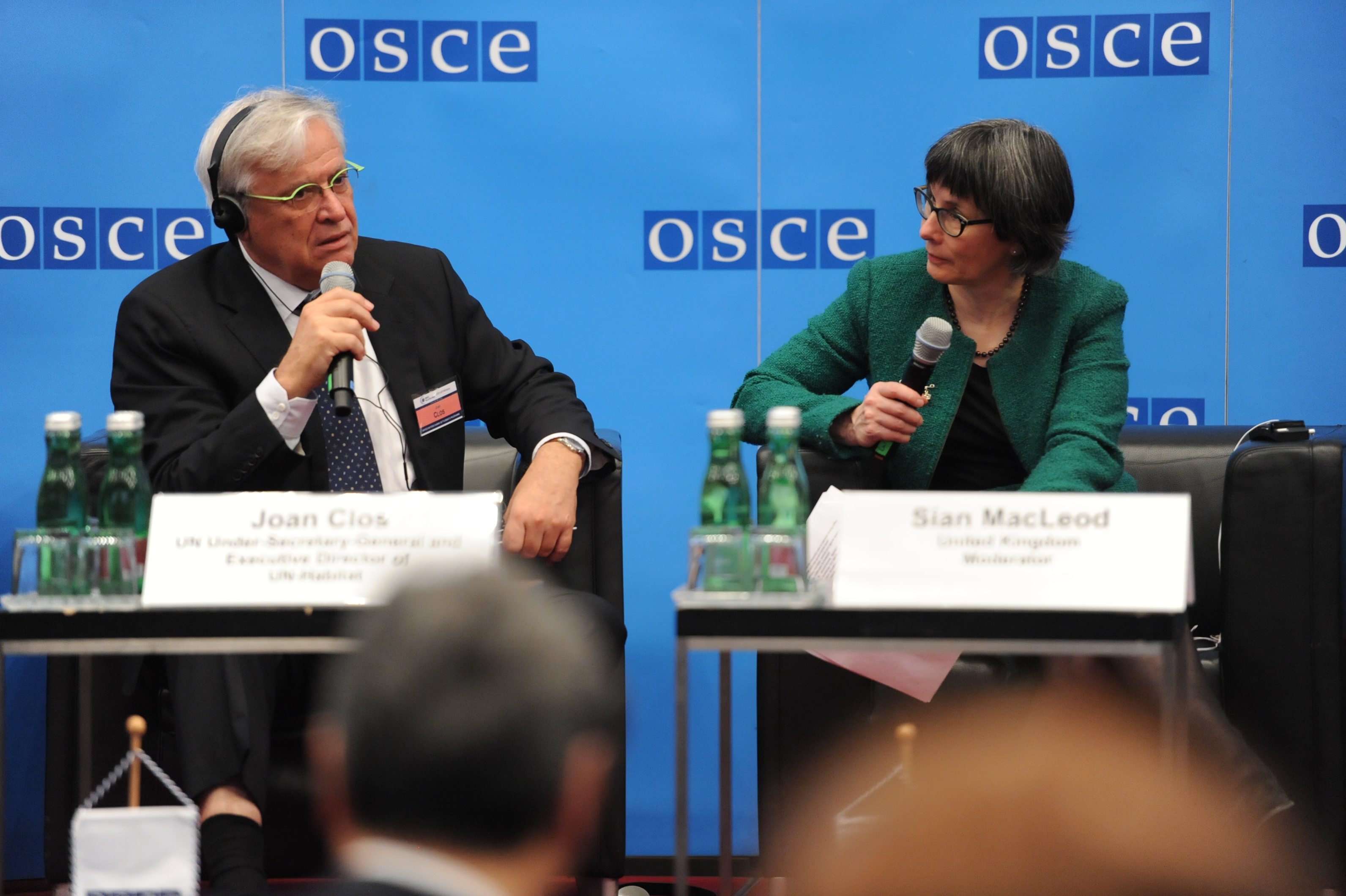 (l-r) Joan Clos, UN Under-Secretary-General and Executive Director of UN-Habitat and Sian MacLeod, Permanent Representative of the United Kingdom to the OSCE during the OSCE Security Days event: "Creating inclusive, safe and sustainable cities: Local approaches to global challenges", Vienna, 31 March 2017.