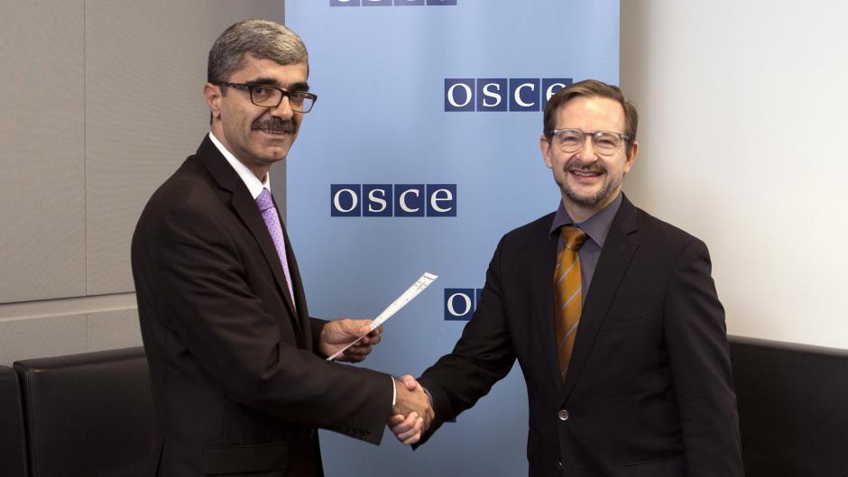 Ambassador Idibek Kalandar (l), Head of Delegation of the Republic of Tajikistan to the OSCE with OSCE Secretary General Thomas Greminger, Vienna, 28 September 2017.