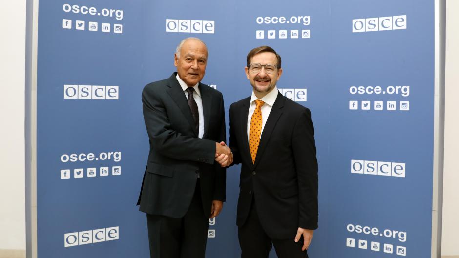 Secretary General of the League of Arab States Ahmed Aboul Gheit (l) and OSCE Secretary General Thomas Greminger, Vienna, 17 October 2018.