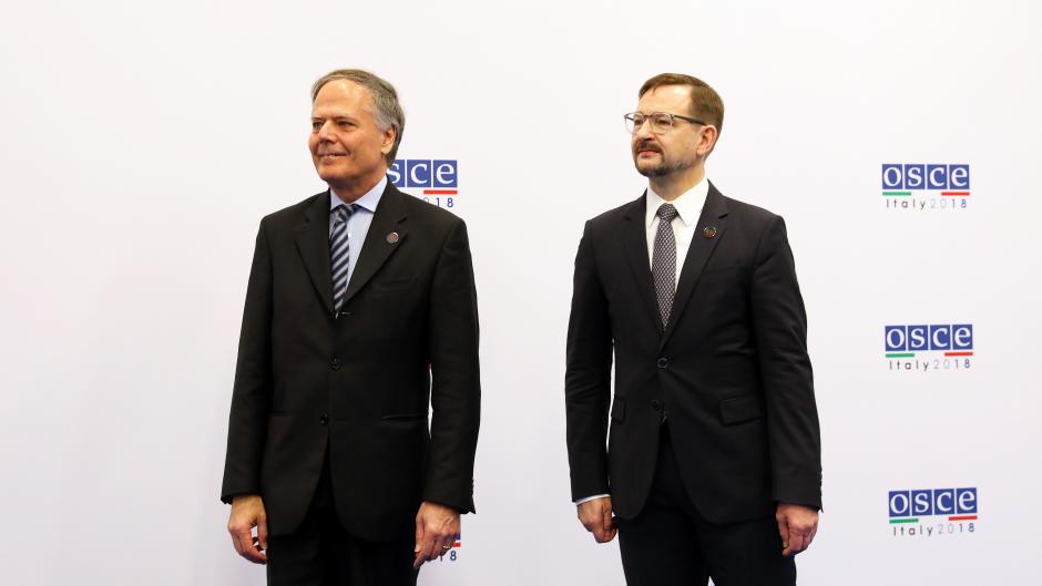 OSCE Secretary General Thomas Greminger (r) and OSCE Chairperson-in-Office and Italian Minister of Foreign Affairs Enzo Moavero Milanesi during the 25th OSCE Ministerial Council, Milan, 6 December 2018.