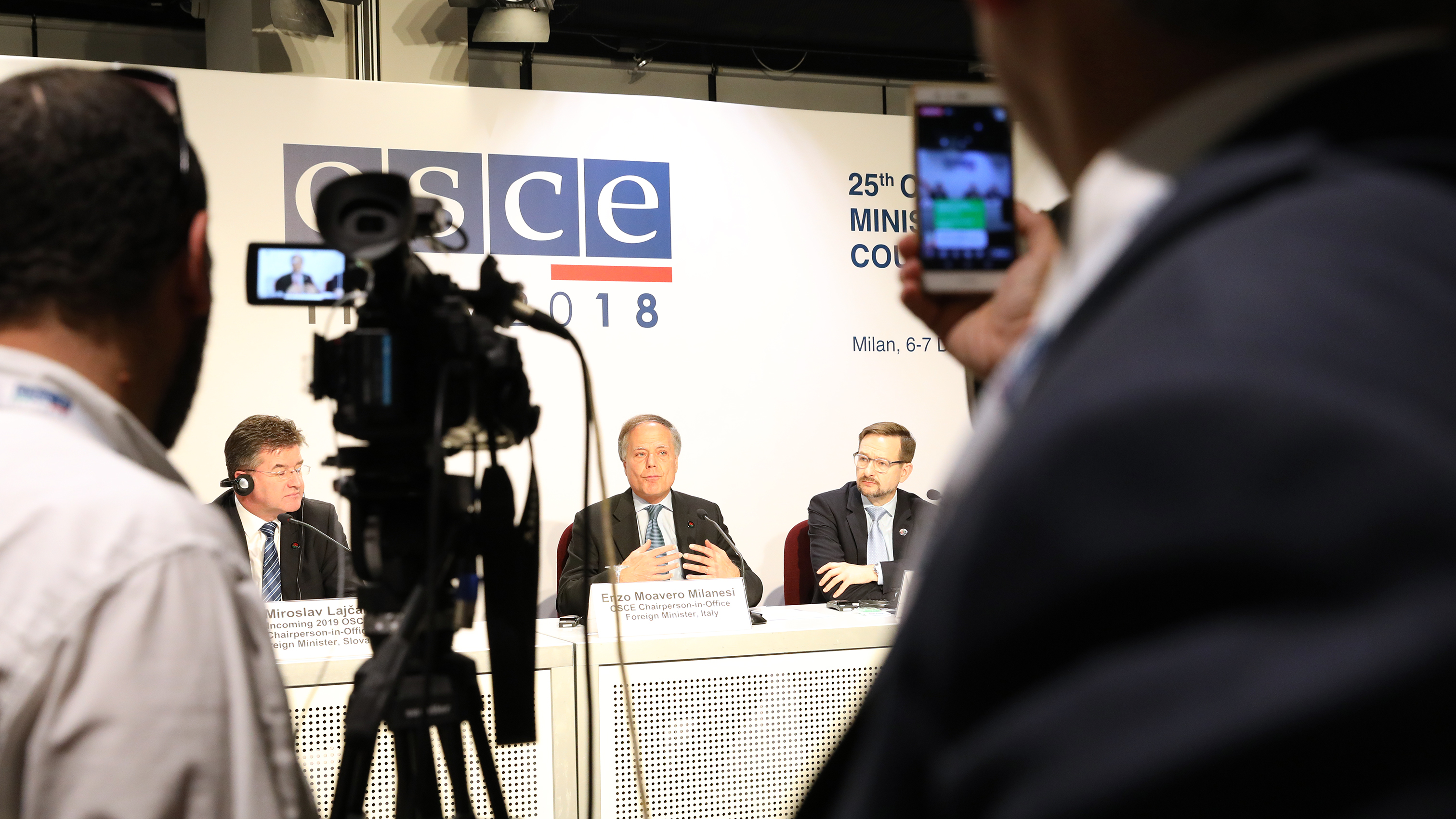 (L-r) Miroslav Lajčák, Minister of Foreign and European Affairs of the Slovak Republic, Enzo Moavero Milanesi, Chairperson-in-Office and Italian Minister of Foreign Affairs, and OSCE Secretary General Thomas Greminger during the final press conference, 25th OSCE Ministerial Council, Milan, 7 December 2018.