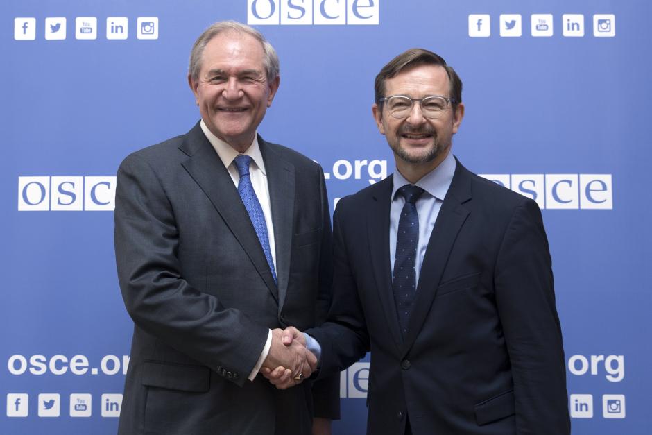 H.E. James S. Gilmore, Ambassador and Permanent Representative of the United States of America to the OSCE, with OSCE Secretary General Thomas Greminger, Vienna, 2 July 2019.