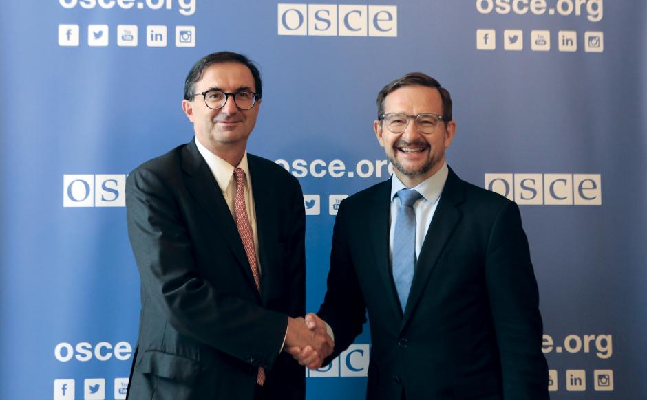 H.E. Wolfgang Amadeus Brühlhart, Permanent Representative of Switzerland to the Organization for Security and Co-operation in Europe, the United Nations and other International Organizations in Vienna, with OSCE Secretary General Thomas Greminger, Vienna, 9 September 2019.