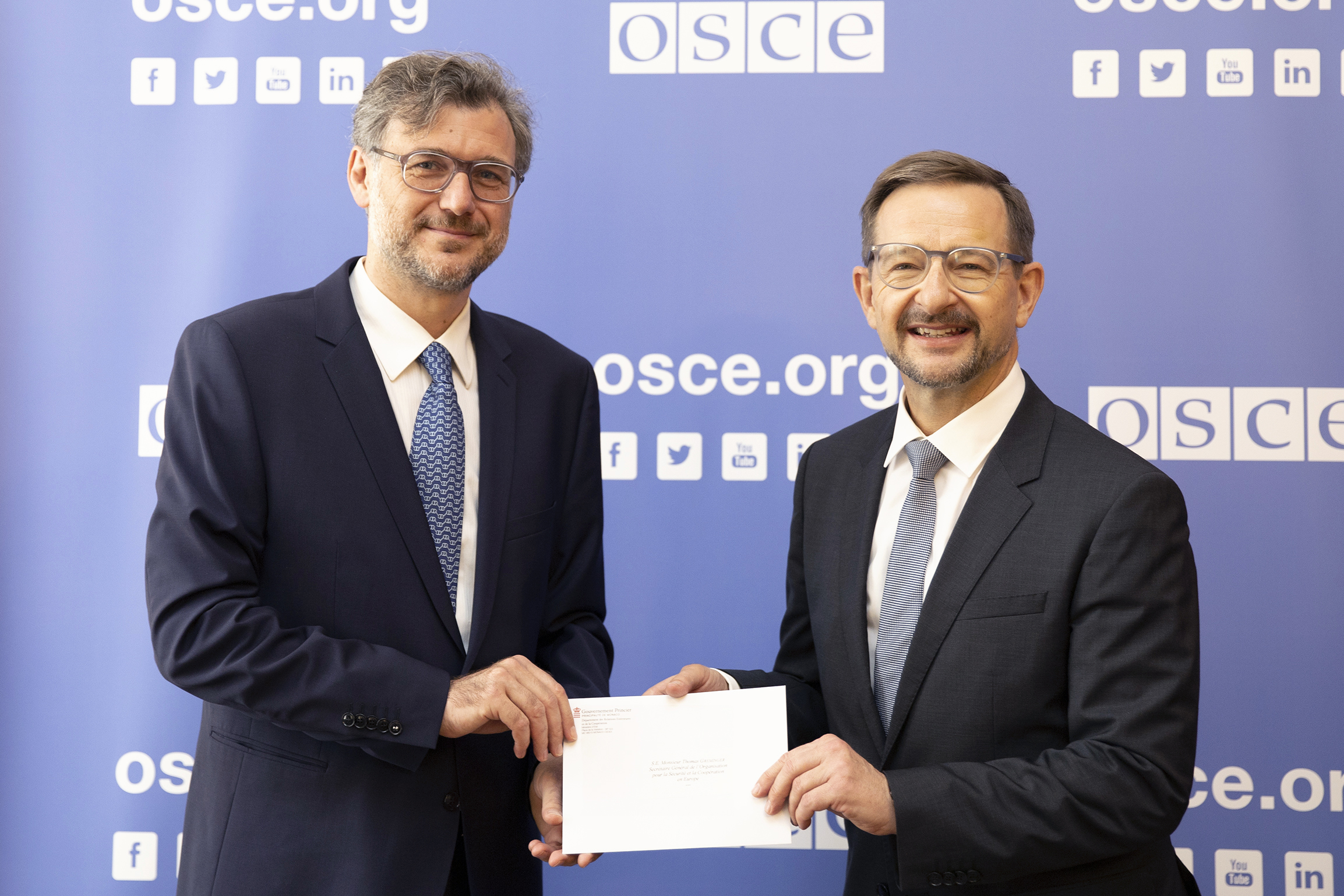H. E. Frédéric Labarrère (l), Ambassador and Permanent Representative of the Principality of Monaco to the OSCE, with OSCE Secretary General Thomas Greminger, Vienna, 6 July 2020.