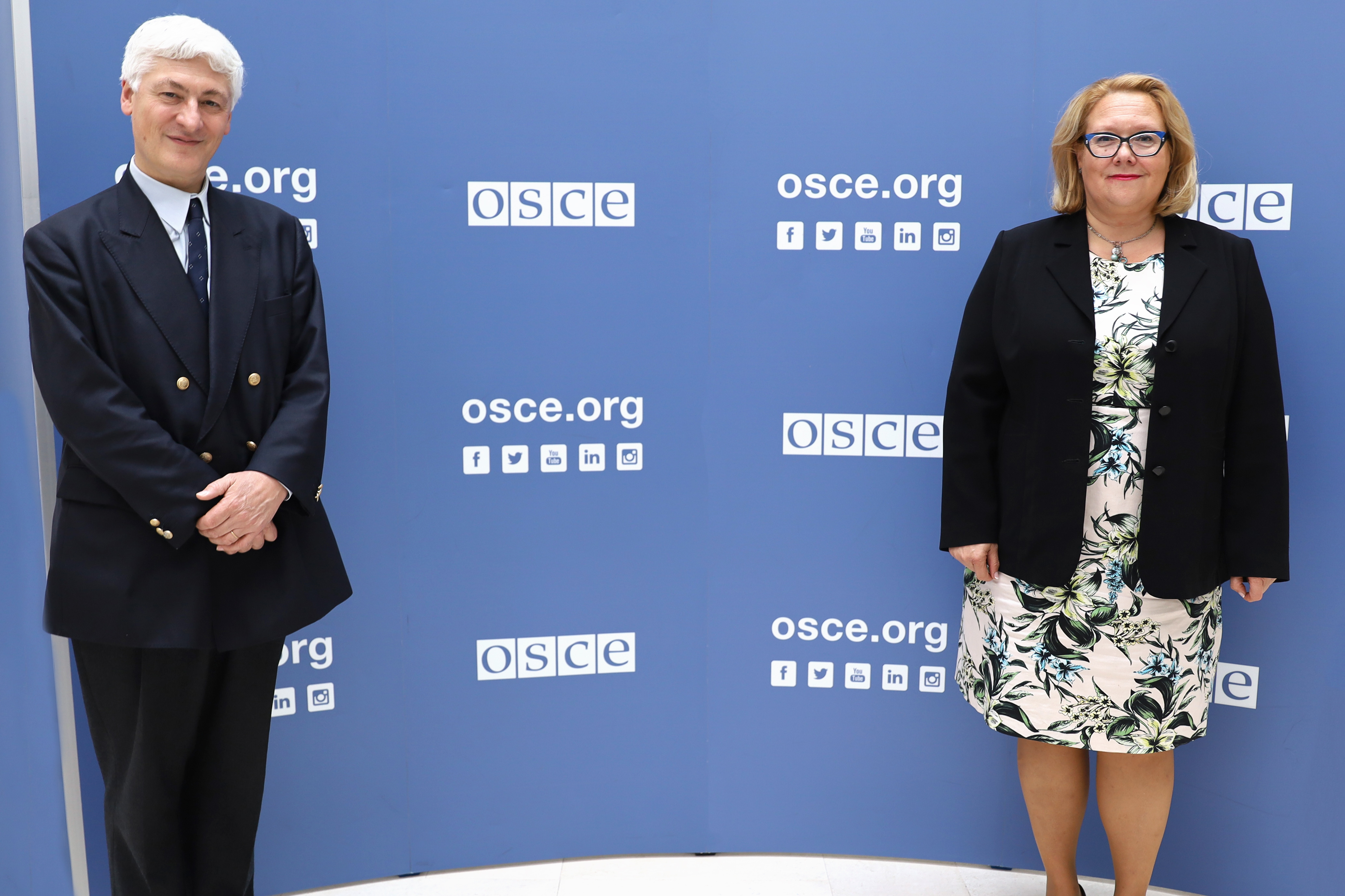 H. E. Didier Nagant de Deuxchaisnes (l), Ambassador and Permanent Representative of Belgium to the OSCE, with Tuula Yrjölä, Officer-in-Charge / Secretary General and Director of the OSCE Conflict Prevention Centre, Vienna, 1 September 2020.