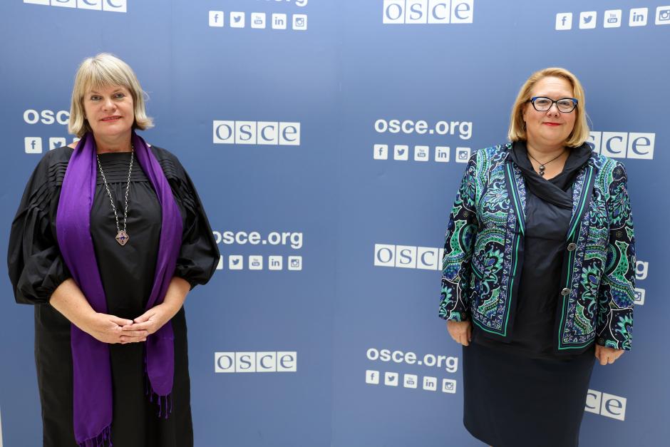 H.E. Anne-Kirsti Karlsen (l), Ambassador and Permanent Representative of Norway to the OSCE, with Tuula Yrjölä, Officer-in-Charge / Secretary General and Director of the OSCE Conflict Prevention Centre, Vienna, 8 September 2020.