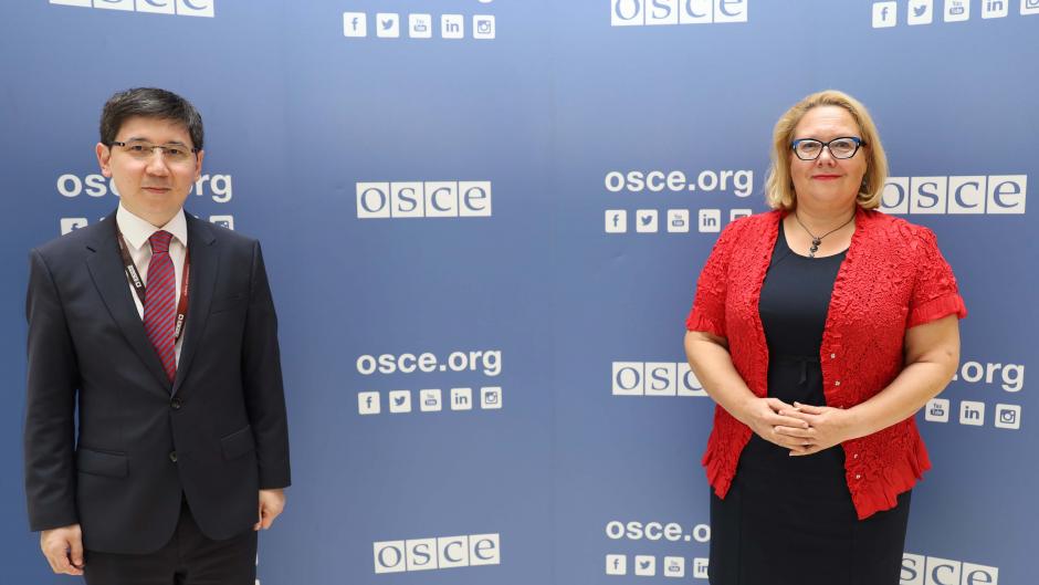 H.E. Abat Fayzullaev (l), Ambassador and Permanent Representative of the Republic of Uzbekistan to the OSCE, with Tuula Yrjölä, Officer-in-Charge / Secretary General and Director of the OSCE Conflict Prevention Centre, Vienna, 25 September 2020.