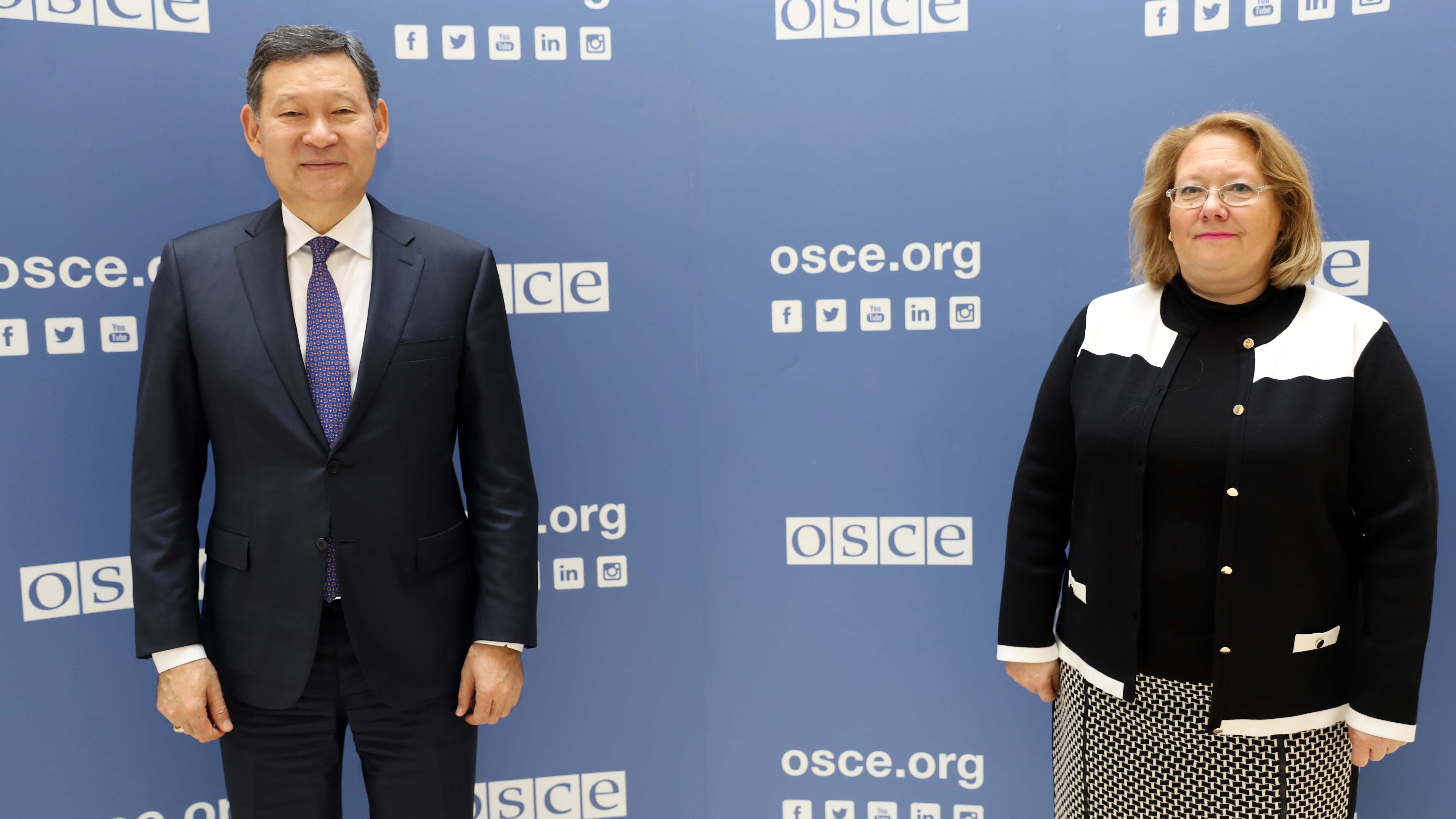H.E. Kairat Umarov (l), Ambassador and Permanent Representative of the Republic of Kazakhstan to the OSCE, with Tuula Yrjölä, Officer-in-Charge / Secretary General and Director of the OSCE Conflict Prevention Centre, Vienna, 27 October 2020.