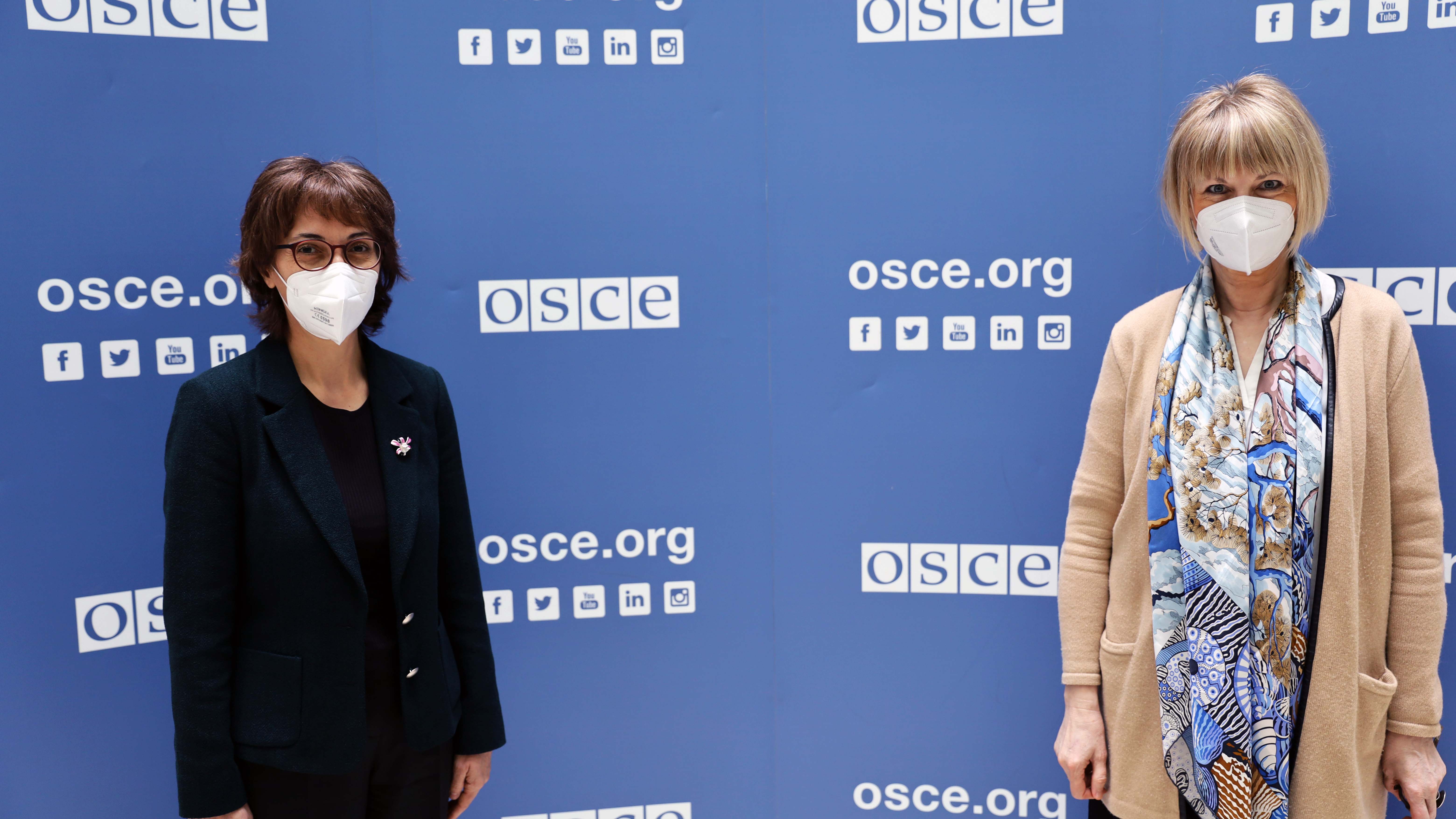 H.E. Hatun Demirer (l), Ambassador and Permanent Representative of Turkey to the OSCE, with OSCE Secretary General Helga Maria Schmid, Vienna, 16 March 2021.